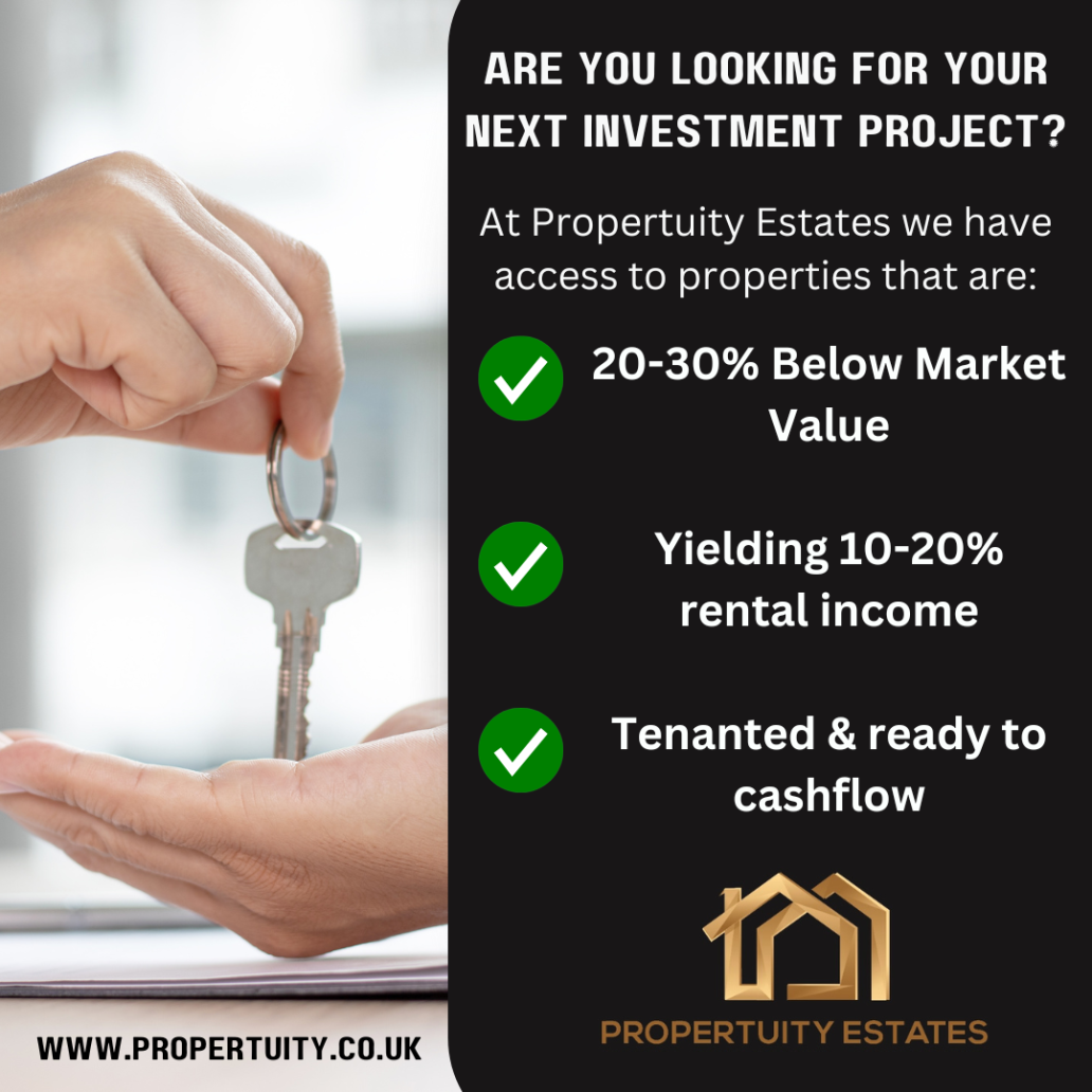 At Propertuity Estates, we understand the importance of securing lucrative investment opportunities that deliver impressive returns while minimizing your workload. That's why our investor services specialize in deal sourcing, dedicated to uncovering below-market-value properties with a minimum yield of 10%. Whether you're a seasoned investor or just starting out, our team leverages industry expertise and extensive networks to identify high-yielding properties tailored to your investment goals. Additionally, we offer hands-off investment services, allowing you to sit back and relax while we handle the entire process—from acquisition to management—ensuring your investment works for you without the stress. Partner with Propertuity Estates for premium investment opportunities and hassle-free returns. Contact us for more details and fill in the form below to get exclusive deals sent straight to your inbox.